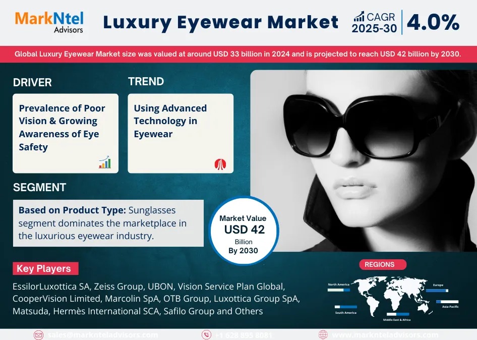 The Global Luxury Eyewear Market size was valued at around USD 33 billion in 2024 and is projected to reach USD 42 billion by 2030.