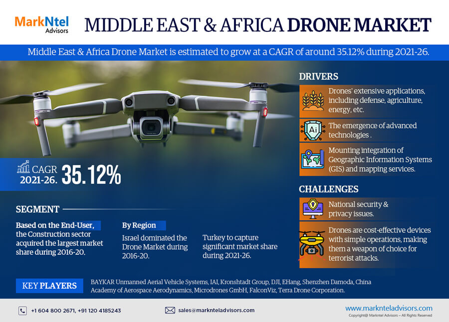 The Middle East & Africa Drones Market is projected to grow at a CAGR of around 35.12% during the forecast period, i.e., 2021-26.
